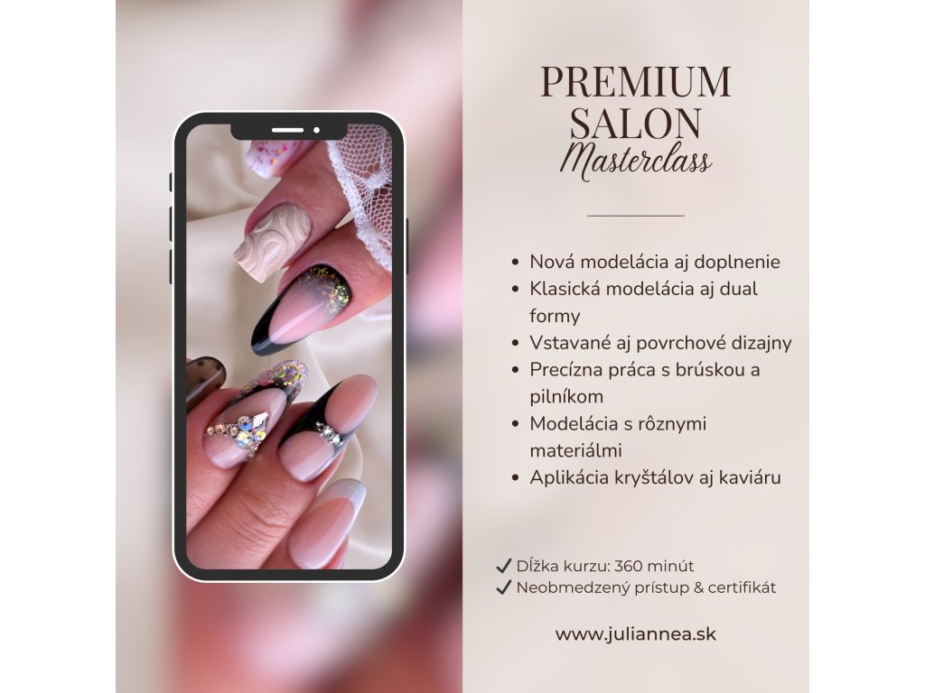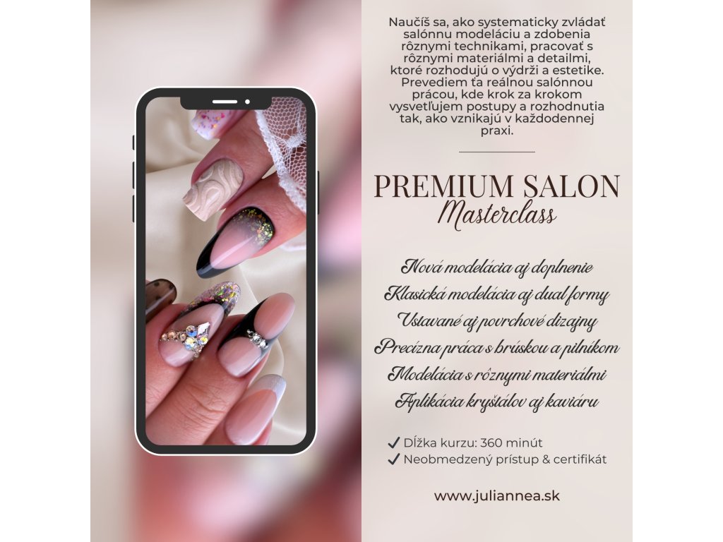 Premium Salon Masterclass je rozsiahly, detailný kurz určený pre nechtárky, ktoré už majú zvládnuté základy a chcú svoju salónnu prácu posunúť na vyššiu, udržateľnú úroveň.
